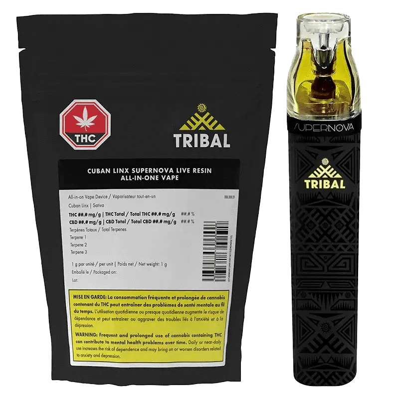 Tribal's Cuban Linx SuperNova live resin all-in-one vape has one ingredient - our fresh frozen Cuban Linx flower (TK Skunk x Trigerian). The breeder is Swamp Boy Seeds. Potent and loaded with a traditional haze flavour, Tribal's SuperNova disposable vape has ceramic hardware and a USB-C rechargeable battery.